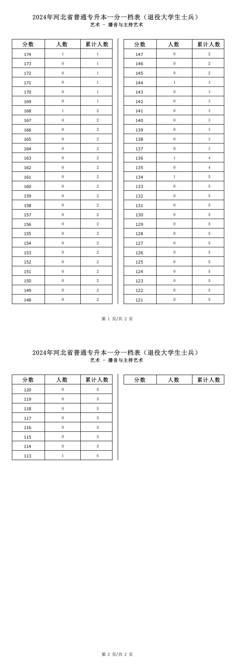 2025年河北艺术类播音与主持艺术专升本退役士兵一分一档表还没有公布,参加25年河北专升本的退役士兵考生可以参考2024年河北省普通专升本播音与主持艺术退役士兵考生一分一档表中的数据。